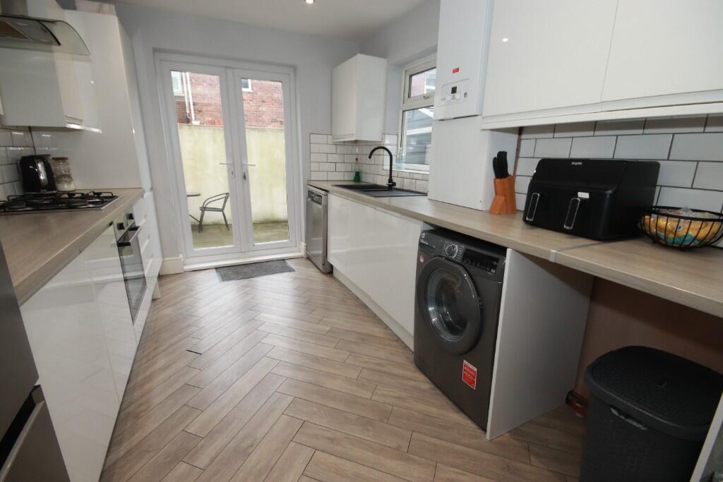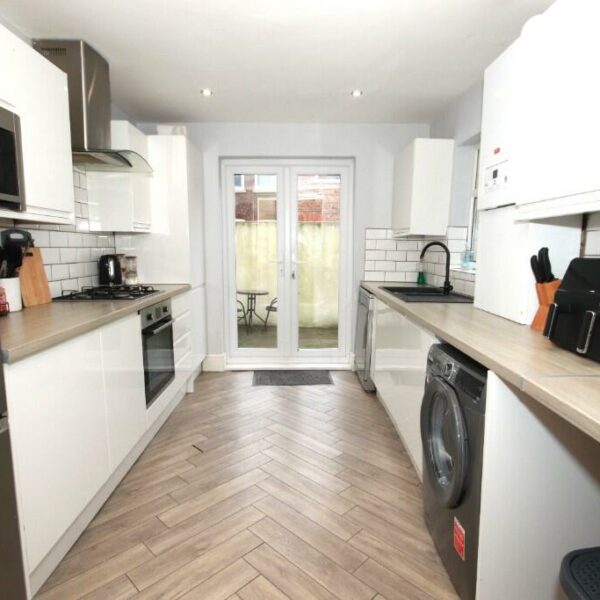 The modern fitted kitchen is thoughtfully designed with a range of contemporary wall and base units, offering ample storage and workspace. French patio doors from the kitchen also provide direct access to the rear yard, enhancing practicality and further brightening the space.