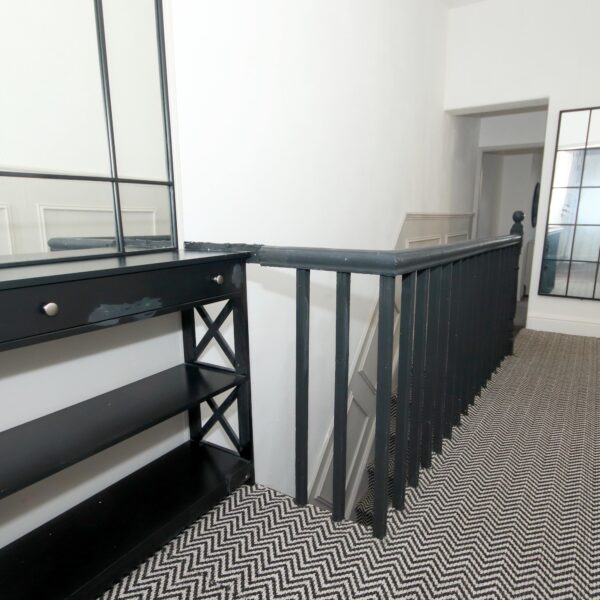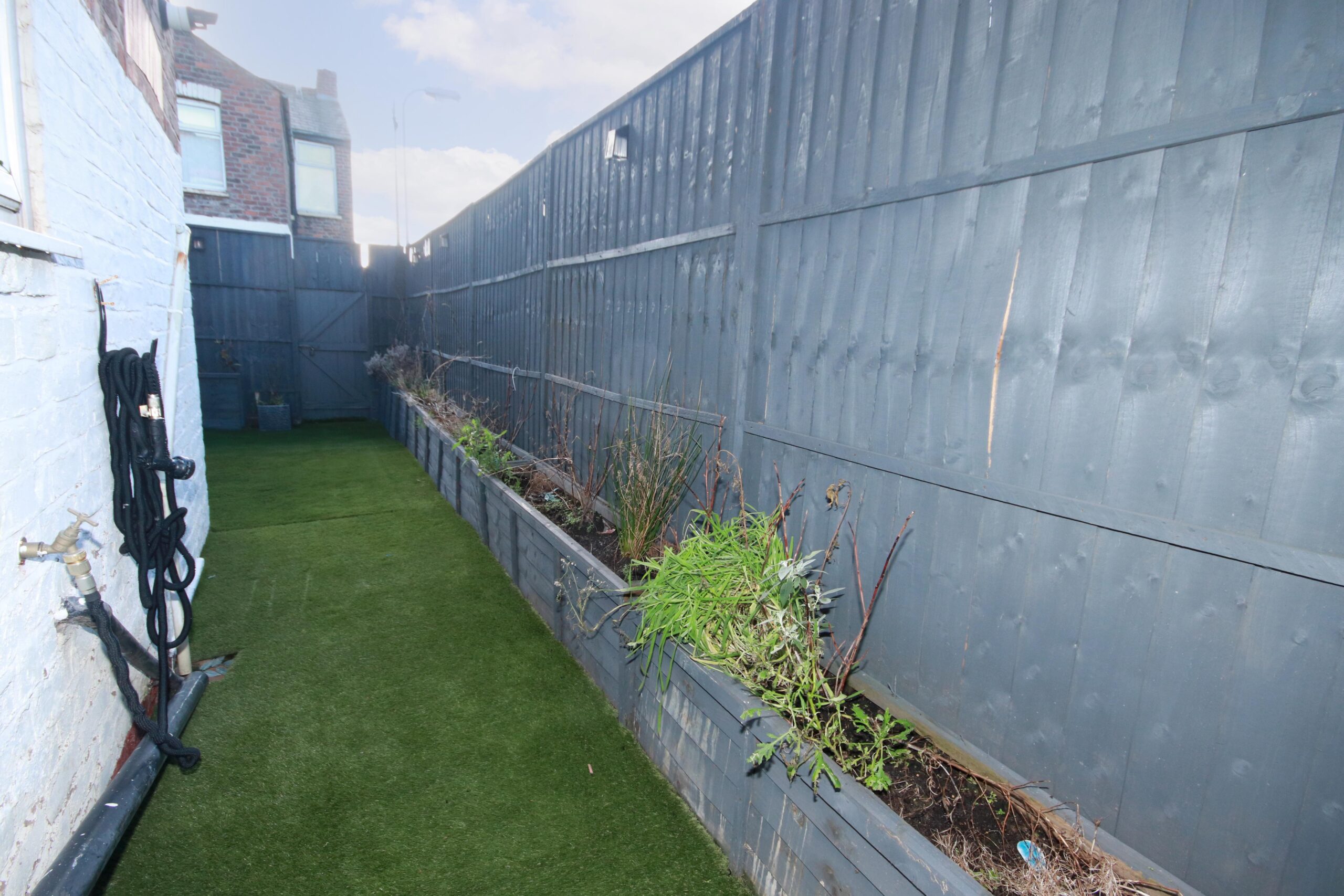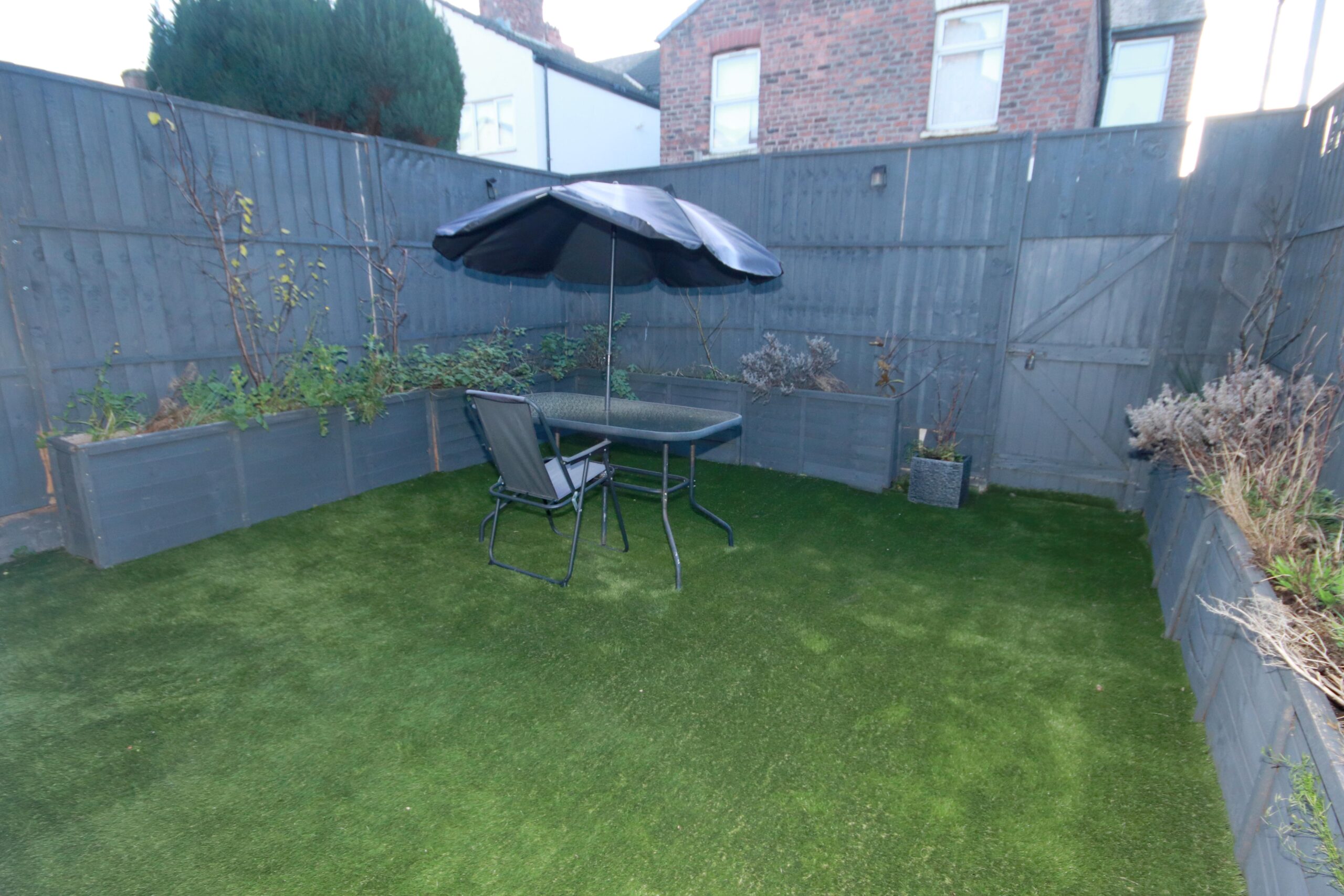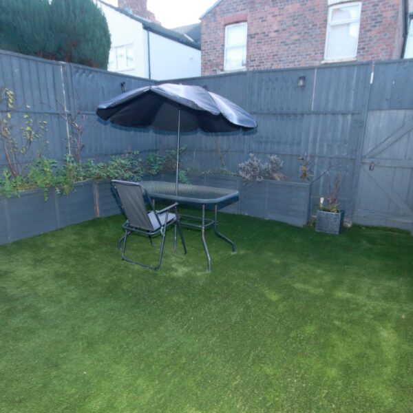 The house boasts a lovely rear garden with a stylish seating area, perfect for outdoor dining or relaxing.