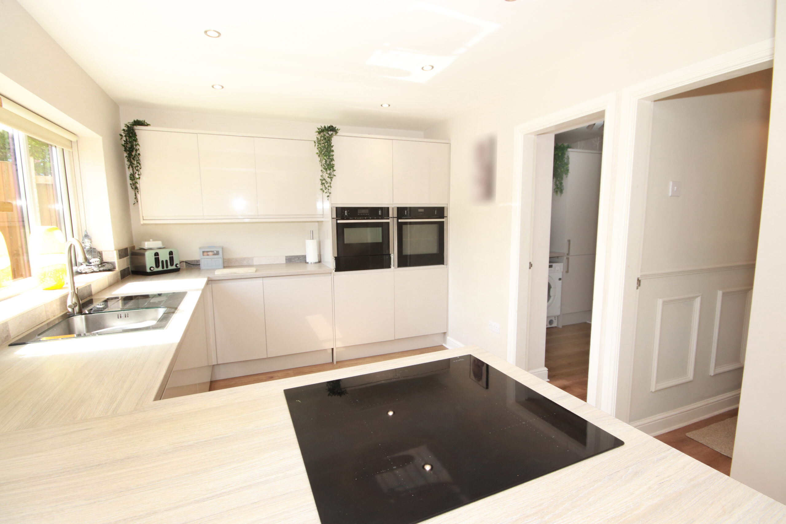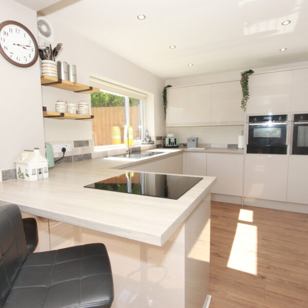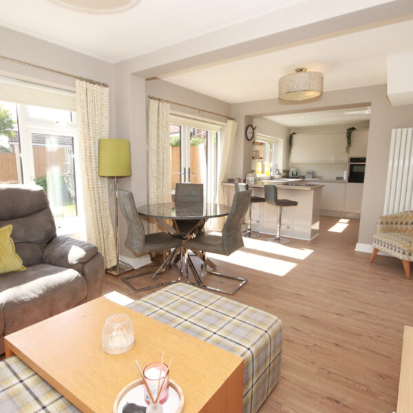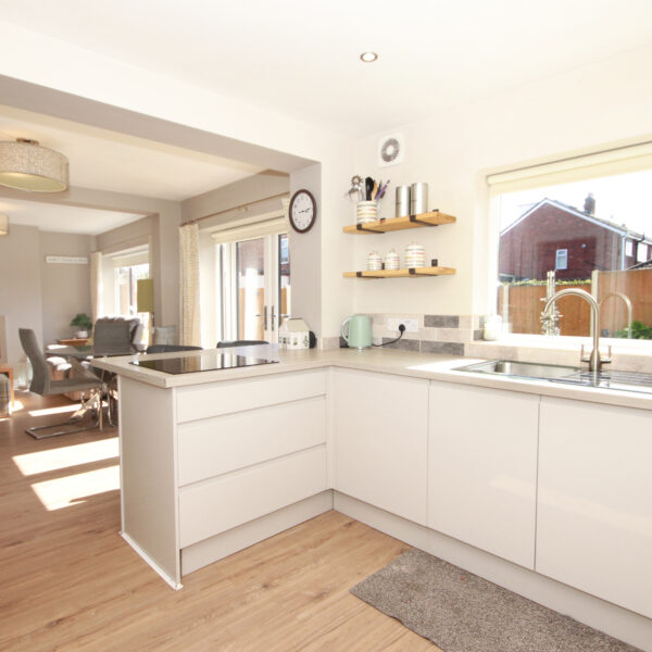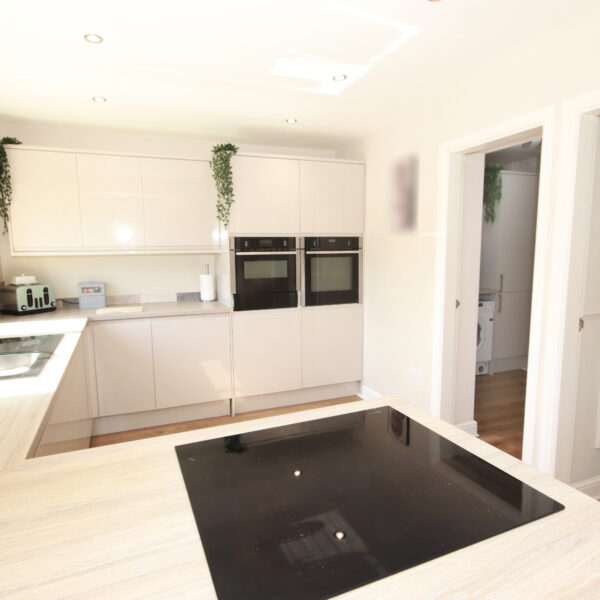 The property is entered via a welcoming entrance hall, providing access to a bright front living room and an impressive rear open-plan kitchen and living space. The contemporary kitchen is fitted with a range of modern units and integral appliances, creating a stylish and practical hub of the home. From the kitchen, there are convenient doorways leading to a utility room and a downstairs WC, with further internal access from the utility room into the garage.